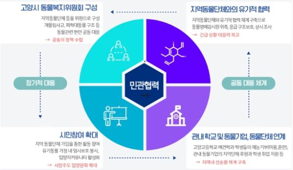 올해 10월 기준 고양시 반려인수는 18만 1000명, 반려동물 등록수 7만 6380마리, 동물 영업장수 564개소다. 시는 '고양시 동물복지 및 생명존중문화 조성 지원 조례' 제정으로 동물복지 정책을 체계적으로 마련하고 동물복지 위원회, 동물구조, 동물보호센터, 분양센터, 반려동물 지원 근거를 마련해왔다.