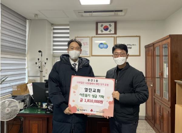 의정부시 송산1동주민센터는 고산동에 소재한 열린교회가 12월 20일 송산1동주민센터에 방문해 고산동 저소득 가구를 위해 사용해달라며 성금 181만 원을 기탁했다고 밝혔다.