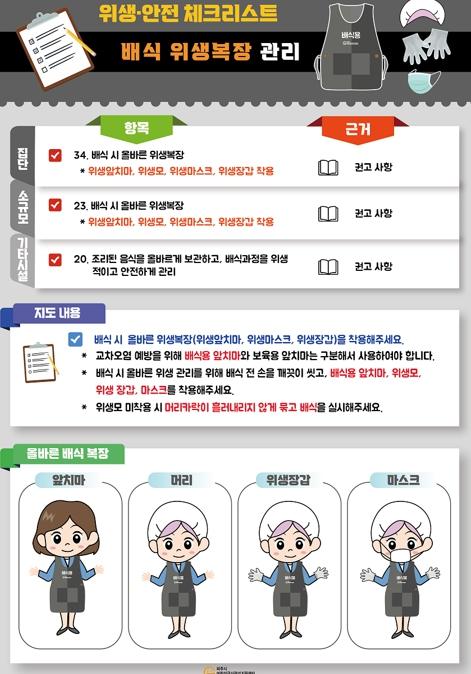 ‘배식용 앞치마’는 면역력이 취약한 영·유아에게 안전하게 음식을 배식하기 위해 보육 교사들이 사용하는 앞치마를 보육용과 배식용으로 나누고자 지원됐다. 또한, 급식 위생문제를 미연에 방지하고자 ‘배식 위생 복장 관리’에 대한 교육 자료를 개발해 지도했다.