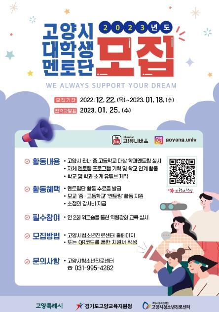 고양특례시 청소년진로센터가 1월 18일까지 2023년 ‘고양유니브’를 모집한다. 고양유니브는 고양시 중·고등학생들의 학과 선택 및 진로 설계를 돕는 대학생 멘토단이다.