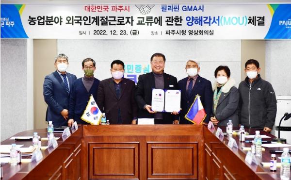 파주시는 23일, 필리핀 제너럴 마리아노 알바레즈(GMA)시와 외국인 계절근로자 교류에 관한 양해각서 협약(MOU)을 체결했다.