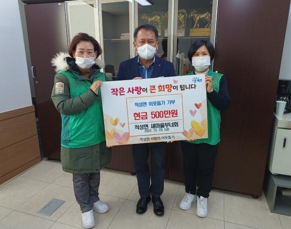 파주시 적성면은 23일 적성면 새마을부녀회에서 지역의 어려운 이웃을 위해 성금 500만원을 기탁했다고 밝혔다.