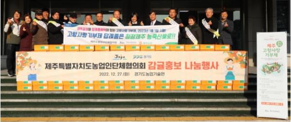 경기도농업기술원은 27일 농업기술원 농업과학교육관에서 제주특별자치도농업인단체협의회와 경기도의회 농정해양위원회 이은주 의원 등 24명이 참석한 가운데 ‘제주감귤 홍보 나눔행사’를 가졌다.