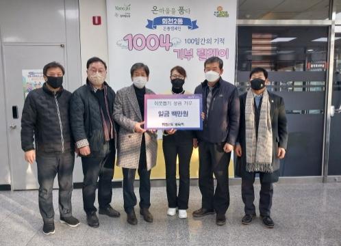 양주시 회천2동 체육회(회장 오응일)는 지난 12월 30일 회천2동 행정복지센터(동장 홍미영)를 통해 온품캠페인 기부릴레이 이웃돕기 성금 100만원을 기탁했다.