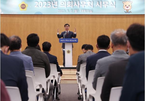 염종현 경기도의회 의장이 2일 ‘2023년 의회사무처 시무식’을 갖고 지방시대의 성공적 개막을 위해 전력을 다해 줄 것을 공직자들에게 당부했다.