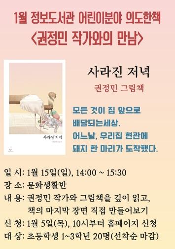 '사라진 저녁'은 남의 손을 빌리지 않고서는 아무것도 할 수 없게 된 우리에게 당장의 편리를 위해 희생되는 비대면 시대의 그늘을 익살스럽고도 섬?한 풍자로 그린 그림책이다. 1월 15일(일), 14시에 권정민 작가와의 만남을 통해 책에 대한 궁금증을 해소하고 책의 마지막 장면을 직접 완성해보는 시간을 가질 예정이다.
