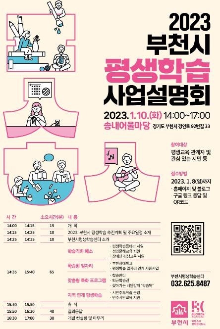 ‘2023년 평생학습 사전설명회’ 참여 희망자는 오는 8일까지 부천시평생학습센터 홈페이지 또는 QR코드를 통해 신청하면 된다.