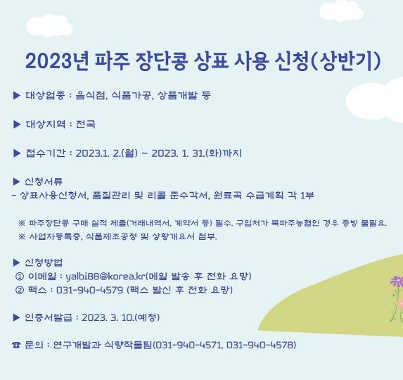상반기 파주장단콩 상표사용 신청 대상은 2023년 상반기 인증 기간이 만료되는 43개소 및 파주장단콩 상표 사용과 전문점 지정을 희망하는 신규 업체로, 파주장단콩을 원료로 사용하는 음식업 및 가공업 등을 운영하는 업체여야 한다.