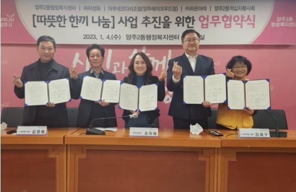 양주시 양주2동 행정복지센터는 지난 4일 (주)자성화, 어부네코다리조림 양주레이크우드점, ㈜라온아띠, 양주2동 적십자봉사회와 ‘따뜻한 한끼 나눔’사업 추진을 위한 업무협약을 체결했다고 밝혔다.