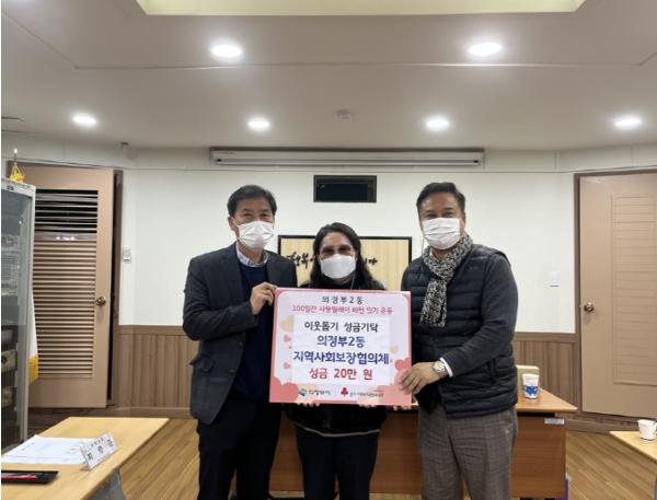 의정부시 의정부2동주민센터는 1월 4일 동 지역사회보장협의체가 100일간 사랑릴레이 배턴잇기에 성금 20만 원을 기탁하는 등 계묘년 새해에도 온정의 손길이 이어지고 있다고 밝혔다.