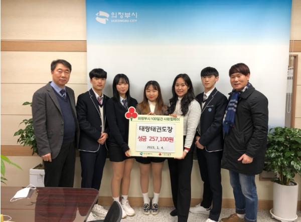 의정부시는 1월 4일 태랑태권도장에서 시청을 방문해 작년 12월 진행했던 의정부시 저소득 아동가구를 위한 성금 모금액 27만 5천 1백 원을 기부하며, 의정부시 100일간 사랑릴레이 배턴잇기 운동에 동참했다고 밝혔다.
