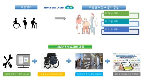 2021년 개발을 완료하고 운영 중인 ‘경기도 편의시설 안내 스마트앱’ 도민 홍보도 강화해 노인·임산부·장애인 등 이동약자들의 이동권 보장을 위해 노력한다. 이 스마트앱을 통해 건축물의 ▲주출입구 경사로 ▲장애인 화장실 ▲장애인전용주차구역 등 이동 약자들의 외출이나 이동 시 꼭 필요한 편의시설 정보를 도민들에게 무료로 제공한다. 사용자의 위치 기반 서비스를 통해 이용자 위치와 가까운 주변 편의시설을 검색할 수 있고, 현재 위치에서 편의시설까지 찾아갈 수 있도록 카카오맵과도 연동됐다. 스마트폰 사용이 어려운 이용자를 위해 음성 인식 검색도 가능하다.