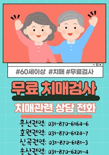 치매는 누구나 걸릴 수 있는 질환으로 치매 조기검진을 통해 치매 증상 완치 또는 중증 상태로의 진행 억제 및 개선하는 것이 가능하여 치매 조기검진과 치매 예방교육은 매우 중요하다. 무료 치매검사는 1963년생부터 가능하며 가까운 권역 치매안심센터에 전화 예약 후 방문하면 된다.