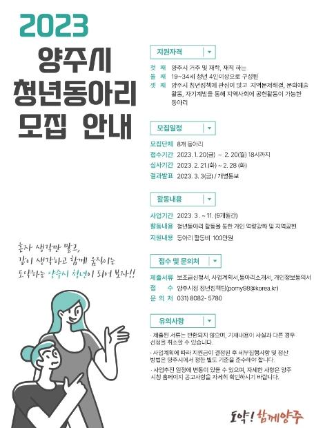 양주시는 오는 2월 20일까지 ‘2023년 청년동아리 지원사업’에 참여할 청년동아리 8팀을 모집한다.