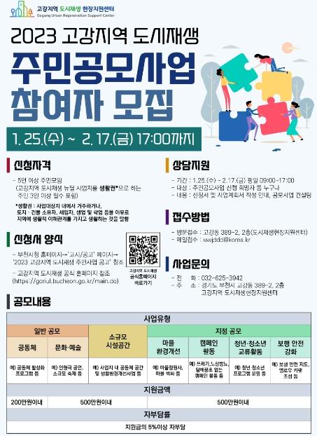 신청 자격은 5인 이상의 고강지역 주민 모임(단체)이고, 다만 이 중 3명은 고강지역 도시재생 뉴딜사업지 내의 지역 주민 및 생활권자를 필수로 포함해야 한다.