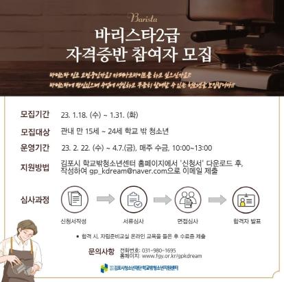 김포시청소년재단(이사장 김병수) 학교밖청소년지원센터는 2023년 학교 밖 청소년의 자립과 성장 지원을 위한 자립기술훈련 '바리스타 2급' 자격증반 참여자를 모집한다.