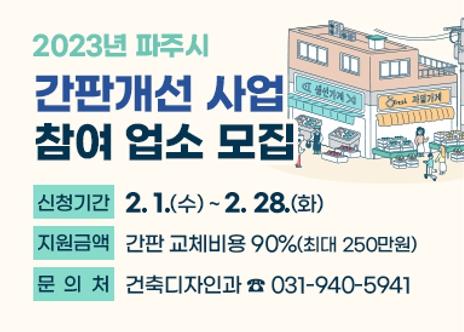 파주시 간판개선사업은 불법·미관 저해·노후 간판의 교체 비용을 지원하는 사업으로, '파주시 예쁜간판 공모전 수상 디자인'을 적용하는 등 거리 특색에 맞는 LED 간판으로 교체하려는 업소를 대상으로 한다.