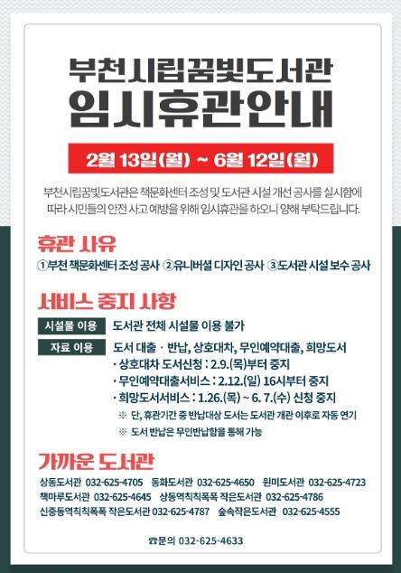 부천시 꿈빛도서관은 부천 책문화센터 조성 및 시설 개선 공사를 추진하면서 2월 13일부터 임시휴관에 들어간다.