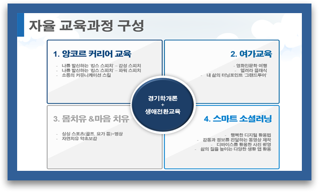 ‘필수 공통교육’ 과정은 경기도의 독특한 역사와 문화를 이해하는 경기학과 은퇴 후 생애설계의 필요성, 실천동기 부여 등 전반적인 인생 재설계 프로그램인 생애전환으로 이루어져 있다.