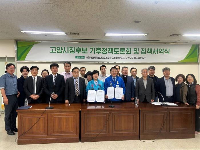 서약식에는 고양특례시장 예비후보 더불어민주당 명재성과 진보당 송영주, 사회적경제뉴스 대표 조응태, 고양탄소제로숲 집행위원장 심온, 고양시기독교총연합회 대표 박남웅이 참여해 기후 대응 정책 추진에 대한 공동 실천 의지를 밝혔다.