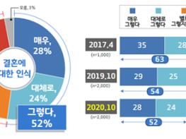 먼저 ‘결혼을 해야 하느냐’는 물음에 52%만이 ‘그렇다’고 답했다. 이는 지난 2017년 조사 시 63%, 2019년 54%보다 낮은 수치다. 응답자 가운데 20~40대 연령대를 살펴보면, ‘결혼을 해야 하느냐’에 ‘그렇다’라는 응답이 47%로 절반에 미치지 못했다. 특히 20~40대 여성 응답은 각각 32%, 40%, 40%로 더 낮았다.