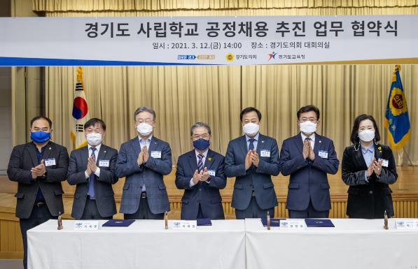 이재명 경기도지사와 이재정 경기도교육감, 장현국 경기도의회 의장 및 박근철 경기도의회 더불어민주당 대표의원은 12일 경기도의회 대회의실에서 ‘경기도 사립학교 공정채용 추진 업무 협약서’에 공동 서명했다.