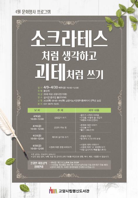 고양시 행신도서관은 사회적 거리두기로 인해 늘어난 여가시간을 유익하게 보내고 싶어 하는 시민들을 위해 오는 4월 9일부터 비대면 글쓰기 강좌 ‘소크라테스처럼 생각하고 괴테처럼 쓰기’를 운영한다.