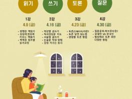 초등학생 학부모인 고양시민 20명을 대상으로 △4월 9일 ‘읽기’ △4월 16일 ‘쓰기’ △4월 23일 ‘토론(디베이트)’ △4월 30일 ‘하브루타’ 등의 주제로 총 4회의 강좌를 진행한다.