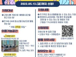 고양시에서 관내 청소년대상으로 공간이 필요한 청소년단체나 청소년동아리는 누구나 신청할 수 있으며 5월 13일까지 전화로 신청하면 된다. 선착순 10팀에 한해 지원되며 성사문화의집 이용청소년을 대상으로 프로그램을 제공할 경우 프로그램에 필요한 소정의 재료비와 테이블, 의자, TV 등을 지원할 예정이다.