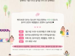 양주청소년문화의집은 오는 14일부터 관내 청소년과 가족단위 참가자가 직접 장터를 운영하는 청소년 벼룩시장 ‘뻔(FUN)한장터’를 운영한다고 밝혔다.