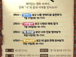 '청소년 영화살롱' 강연은 여름방학을 맞이하여 네 가지 각양각색의 영화를 통해 청소년들이 자신을 돌아보는 시간을 가지고 내면을 다채롭게 표현하는 강연이다.