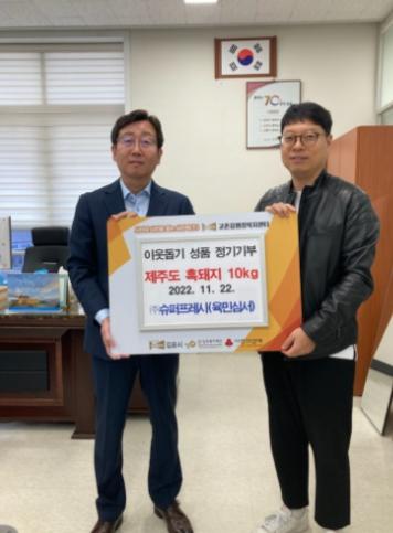 고촌읍 소재 ㈜슈퍼프레시는 22일 고촌읍(읍장 이창우)을 방문, 생활 형편이 녹록지 않은 고촌 주민들을 위해 매월 ‘제주도 흑돼지 10kg’을 정기 기부하기로 약속했다.